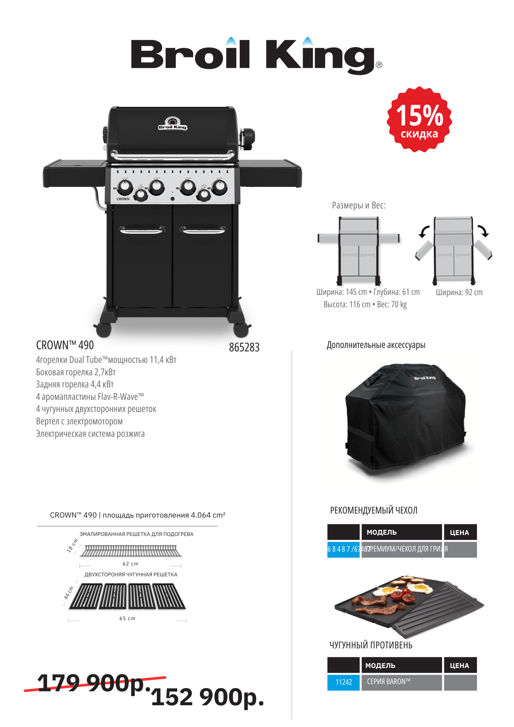 Привлекательный дизайн, складные полки, двухсторонние чугунные решетки задняя горелка и электромотор вертела делают гриль универсальным.